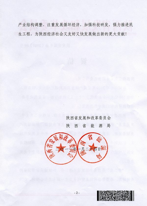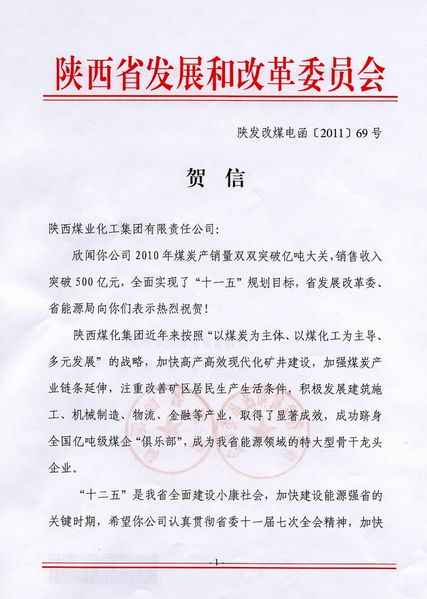 1月24日,陜西省發(fā)展和改革委員會、陜西省能源局聯(lián)合向陜西煤業(yè)化工集團公司發(fā)來賀信,祝賀集團公司2010年煤炭產銷量雙雙突破億噸大關,銷售收入突破500億元,全面實現(xiàn)了“十一五”規(guī)劃目標。