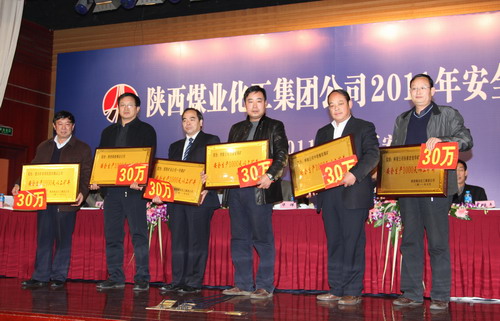 集團(tuán)公司副總經(jīng)理朱周岐宣讀表彰決定,對(duì)2010年度安全生產(chǎn)先進(jìn)集體和先進(jìn)工作者、實(shí)現(xiàn)安全生產(chǎn)1000天以上的煤礦,2010年安全質(zhì)量標(biāo)準(zhǔn)化、安全生產(chǎn)管理質(zhì)量標(biāo)準(zhǔn)化先進(jìn)單位和安全質(zhì)量標(biāo)準(zhǔn)化先進(jìn)煤礦及2009年度國(guó)家級(jí)安全質(zhì)量標(biāo)準(zhǔn)化礦井進(jìn)行了表彰,華煒、高仰才、周書年、馬延平、藺國(guó)杰、陳存德、趙秦川、閔龍、朱周岐為獲獎(jiǎng)集體和個(gè)人頒發(fā)獎(jiǎng)牌、證書和獎(jiǎng)金。