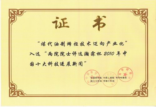 由中國(guó)科學(xué)院院士工作局、中國(guó)工程院學(xué)部工作局和科學(xué)時(shí)報(bào)社共同主辦,557名中國(guó)科學(xué)院院士和中國(guó)工程院院士投票評(píng)選,瀚霖杯2010年中國(guó)十大科技進(jìn)展新聞和世界十大科技進(jìn)展新聞,2011年1月19日在北京揭曉。陜西煤業(yè)化工集團(tuán)有限責(zé)任公司“煤代油制烯烴技術(shù)邁向產(chǎn)業(yè)化”光榮入選2010年中國(guó)十大科技進(jìn)展新聞。