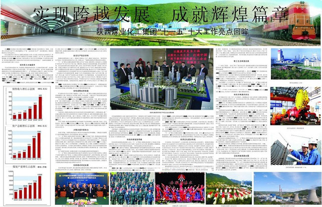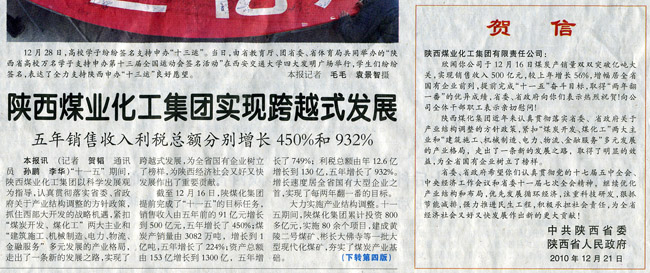 繼12月17日,陜西日?qǐng)?bào)一版報(bào)眼發(fā)表《陜煤化集團(tuán)煤炭產(chǎn)銷雙雙突破億噸大關(guān)——實(shí)現(xiàn)銷售收入500億,增幅居全省國(guó)企前列》報(bào)道之后,今日,陜西日?qǐng)?bào)再次在一版顯著位置發(fā)表《陜西煤業(yè)化工集團(tuán)實(shí)現(xiàn)跨越式發(fā)展——五年銷售收入利稅總額分別增長(zhǎng)450%和932%》,和中共陜西省委、陜西省人民政府祝賀陜西煤業(yè)化工集團(tuán)實(shí)現(xiàn)“十一五”奮斗目標(biāo)的賀信,并在該報(bào)20-21通版以《實(shí)現(xiàn)跨越發(fā)展 成就輝煌篇章——陜西煤業(yè)化工集團(tuán)“十一五”十大工作亮點(diǎn)回眸》進(jìn)行了深度報(bào)道。