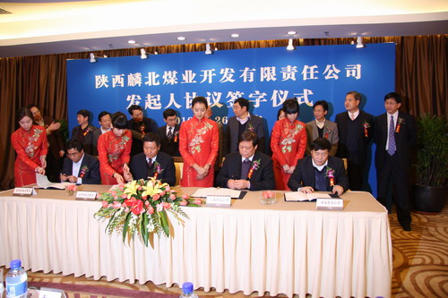 11月26日下午,陜西麟北煤業(yè)開發(fā)有限責任公司發(fā)起人協(xié)議簽字儀式在西安索菲特人民大廈會展中心舉行。省國資委副主任王浩生,寶雞市政府常務副市長上官吉慶,陜西省投資集團黨委書記、董事長梁平,陜西煤業(yè)化工集團公司副總經(jīng)理尚建選,省煤田地質(zhì)局局長、省煤田地質(zhì)集團公司董事長張斌成,府谷能源開發(fā)公司黨委書記、執(zhí)行董事張文華,匯森煤業(yè)公司總經(jīng)理王建利等出席簽字儀式。