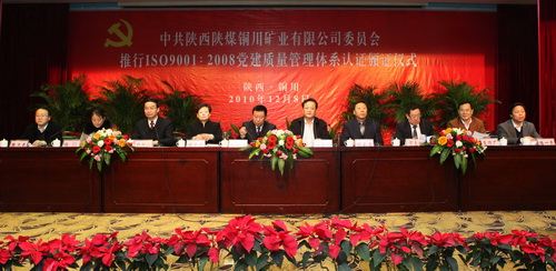 歷經(jīng)8 個(gè)月的工作,于12月8日上午,銅川礦業(yè)有限公司委員會黨建工作質(zhì)量管理體系順利通過了北京新世紀(jì)認(rèn)證有限公司現(xiàn)場審定,并取得認(rèn)證書。這是陜西省國有企業(yè)首家取得ISO9000質(zhì)量管理體系認(rèn)證的單位。省國資委黨委副書記、紀(jì)委書記高新華,陜煤化集團(tuán)黨委副書記馬富元、黨群工作部部長夏迎廣及銅川市和銅川礦業(yè)公司相關(guān)領(lǐng)導(dǎo)和人員共160余人參加了認(rèn)證頒證儀式。銅川礦業(yè)公司黨委書記杜樹山主持認(rèn)證頒證儀式。