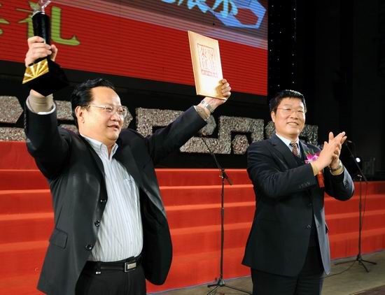 黃陵礦業(yè)公司總經(jīng)理宋老虎接受陜西省企業(yè)文化建設(shè)示范單位獎(jiǎng)牌