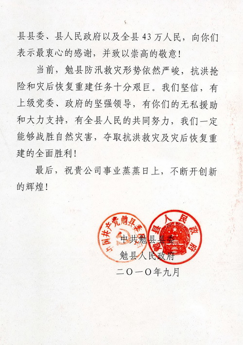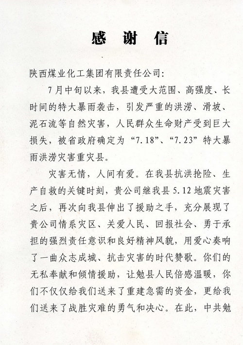 座談中,勉縣縣長(zhǎng)李芳代表縣委、縣政府及全縣43萬(wàn)人民,對(duì)陜煤化集團(tuán)在今年“7.18”、“7.23”特大暴雨洪災(zāi)中,向勉縣伸出無(wú)私援助和災(zāi)后恢復(fù)重建工作的大力支持表示衷心感謝。并送來(lái)感謝信和寫(xiě)有“心系災(zāi)區(qū)獻(xiàn)大愛(ài),無(wú)私援助暖人心”牌匾,表達(dá)了災(zāi)區(qū)人民的感恩之情。她說(shuō),援助災(zāi)區(qū)充分體現(xiàn)了陜煤化集團(tuán)情系災(zāi)區(qū)、關(guān)愛(ài)人民、回報(bào)社會(huì)、勇于承擔(dān)的社會(huì)責(zé)任意識(shí)和良好的精神風(fēng)貌,有陜煤化集團(tuán)的大力支持,全縣人民一定能奪取抗洪救災(zāi)和災(zāi)后恢復(fù)重建的全面勝利。在聽(tīng)取了勉縣領(lǐng)導(dǎo)對(duì)暴雨洪災(zāi)恢復(fù)重建工作的開(kāi)展情況匯報(bào)后,總經(jīng)理高仰才講到,恢復(fù)重建的工作方案措施得力,進(jìn)展很快,相信勉縣領(lǐng)導(dǎo)班子能夠克服一切困難做好重建工作。他說(shuō),陜煤化集團(tuán)在快速發(fā)展的同時(shí),也盡最大的能力承擔(dān)著一個(gè)國(guó)有企業(yè)應(yīng)盡的社會(huì)責(zé)任義務(wù)。近幾年來(lái),累計(jì)為社會(huì)捐款1.1億元,并在抗擊冰凍災(zāi)害、支援地震災(zāi)區(qū)建設(shè)、社會(huì)扶貧等方面發(fā)揮國(guó)有企業(yè)應(yīng)有的作用。