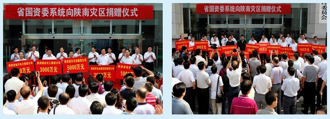 面對重大災情,省國資委黨委高度重視,立即成立了救災募捐活動領導小組,在密切關注搶險救災的同時,號召省國資委系統(tǒng)企業(yè)迅速行動起來,克服各種實際困難,勇于承擔社會責任,以實際行動幫助災區(qū)群眾渡過難關,重建家園。在省國資委系統(tǒng)企業(yè)向陜南災區(qū)捐贈儀式上,副省長、省救災與災后重建工作領導小組組長姚引良出席捐贈儀式并作重要講話,省國資委黨委書記、主任白阿瑩進行捐贈動員。省民政廳等有關部門領導出席捐贈儀式。共有36戶省國資委監(jiān)管企業(yè)和19戶中央駐陜企業(yè)參與了現場捐助,共募集資金1.9398億元,所捐款項將全部用于災區(qū)的受災群眾房屋以及醫(yī)院學校等設施的重建。