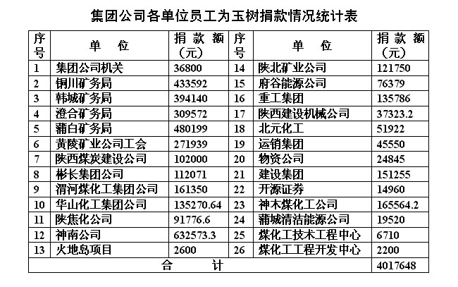 陜煤化集團公司為玉樹地震捐款901.7萬元