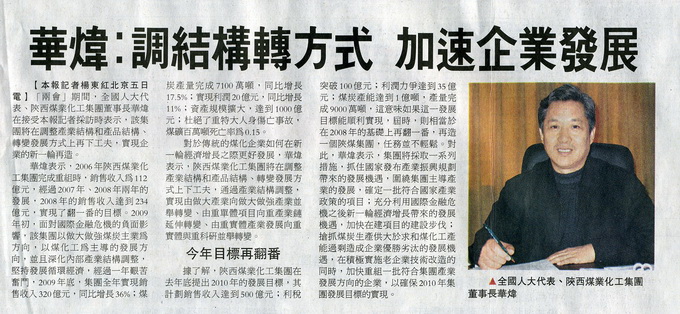 香港大公報(bào)2010年3月6日A20版刊登本報(bào)記者在北京對(duì)全國(guó)人大代表、陜煤化集團(tuán)公司董事長(zhǎng)、黨委書(shū)記采訪的消息
