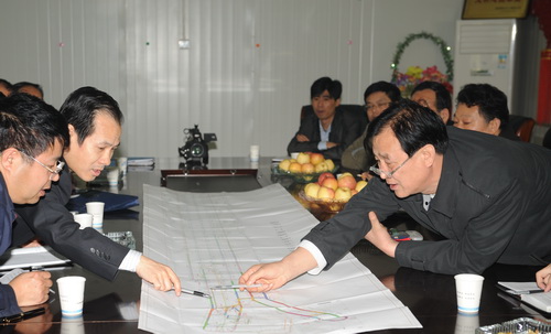 在胡家河礦井建設(shè)現(xiàn)場召開的會(huì)議上,總經(jīng)理高仰才詢問了胡家河礦井現(xiàn)場負(fù)責(zé)人趙強(qiáng)工程進(jìn)展情況,趙強(qiáng)對照礦井建設(shè)圖紙就胡家河礦井目前井底大巷建設(shè)、孟村礦井凍結(jié)打鉆工程等多項(xiàng)工程進(jìn)展情況作了詳細(xì)匯報(bào)??偨?jīng)理高仰才在聽取完匯報(bào)后,就巷道建設(shè)中存在落差的問題與王蓬、趙強(qiáng)及相關(guān)技術(shù)人員展開熱烈的探討。副總經(jīng)理閔龍、朱周岐對建設(shè)工程的安全管理等方面提出了要求。