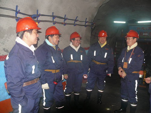 集團公司副總經(jīng)理朱周岐(左二)在朱家河礦井下檢查安全質(zhì)量標準化工作。
