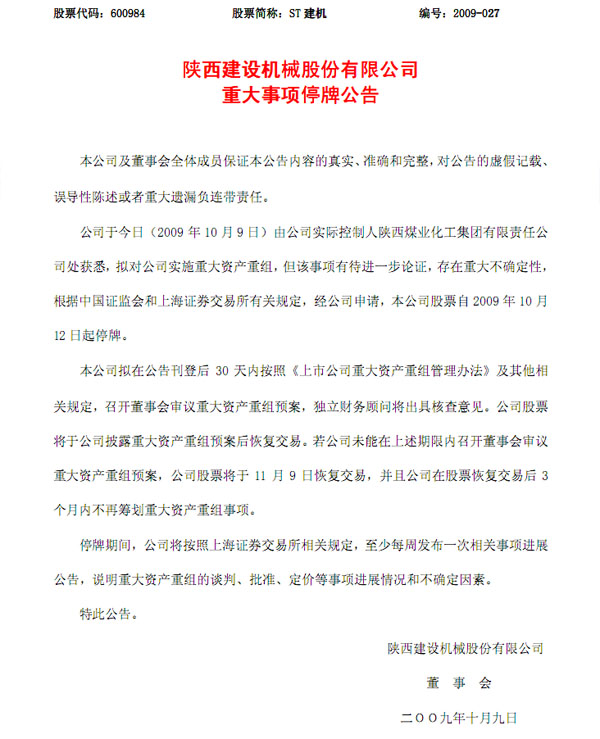 10月9日,陜西建設機械股份有限公司發(fā)布重大事項停牌公告,全文如下。