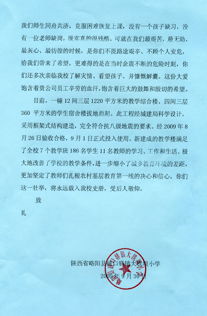 感謝信中寫到,去年5?12四川汶川特大地震中,大鐵壩小學(xué)一幢8間240平方米的教學(xué)樓變得搖搖欲墜,11間220平方米的師生宿舍及辦公用房四處破裂。災(zāi)后,學(xué)校搭建帳篷自立自救,爭(zhēng)取活動(dòng)板房搭建教室,開始頂風(fēng)雨、冒嚴(yán)寒,師生同舟共濟(jì),克服困難恢復(fù)上課。就在這時(shí),陜西煤業(yè)化工集團(tuán)公司黨委書記、董事長(zhǎng)華煒一行在余震不斷的情況下,不畏路途艱辛、不顧個(gè)人安危,親臨學(xué)校了解災(zāi)情、看望孩子、并慷慨解囊,援助該校重建。目前,一幢12間三層1220平方米的教學(xué)綜合樓、四間三層360平方米的學(xué)生宿舍樓拔地而起。此工程經(jīng)城建局科學(xué)設(shè)計(jì),采用框架式結(jié)構(gòu)建造,完全符合抗八級(jí)地震的要求。經(jīng)2009年8月26日驗(yàn)收合格,9月1日正式投入使用。新建成的教學(xué)樓滿足了全校7個(gè)教學(xué)班186名學(xué)生11名教師的學(xué)習(xí)、工作和生活。極大地改善了學(xué)校的教學(xué)條件,進(jìn)一步縮小了城鄉(xiāng)教育環(huán)境的差距,更加堅(jiān)定了教師們?cè)r(nóng)村基層教育第一線的決心和信心。感謝信最后,飽含感恩之心寫到:“你們這一壯舉,將永遠(yuǎn)載入我校史冊(cè),受后人敬仰。”