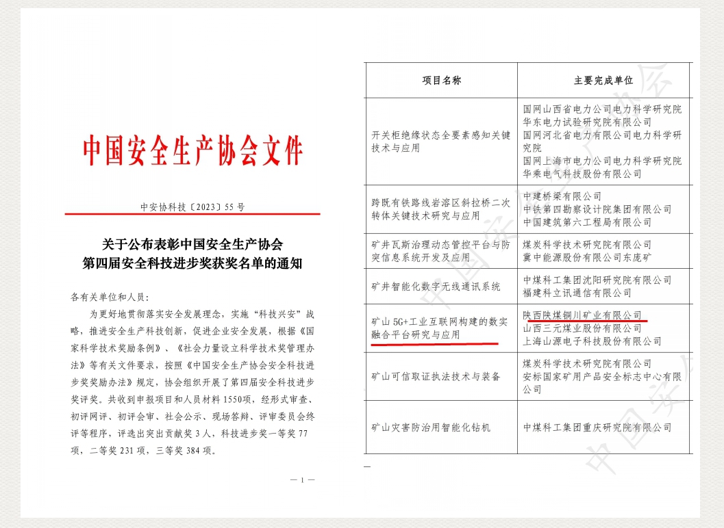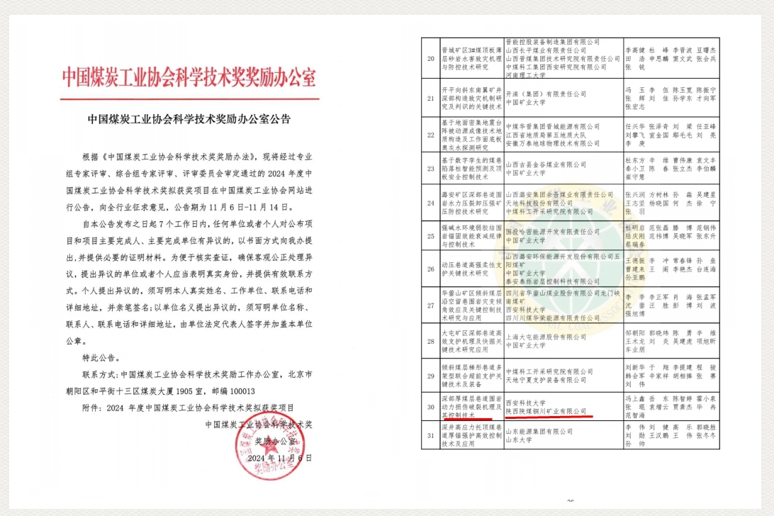 近日,中國煤炭工業(yè)協(xié)會(huì)和中國安全生產(chǎn)協(xié)會(huì)分別公布了科學(xué)技術(shù)獲獎(jiǎng)項(xiàng)目,公司兩項(xiàng)科技成果獲獎(jiǎng),其中,公司與山西三元煤業(yè)公司、上海山源電子科技公司共研發(fā)的《礦山5G+工業(yè)互聯(lián)網(wǎng)構(gòu)建的數(shù)實(shí)融合平臺(tái)研究與應(yīng)用》榮獲中國安全生產(chǎn)協(xié)會(huì)第四屆安全科技進(jìn)步二等獎(jiǎng)。公司與西安科技大學(xué)共同研發(fā)的項(xiàng)目《深部厚煤層圍巖動(dòng)力操作破裂機(jī)理及其控制技術(shù)》榮獲2024年度中國煤炭工業(yè)協(xié)會(huì)科技技術(shù)三等獎(jiǎng)。