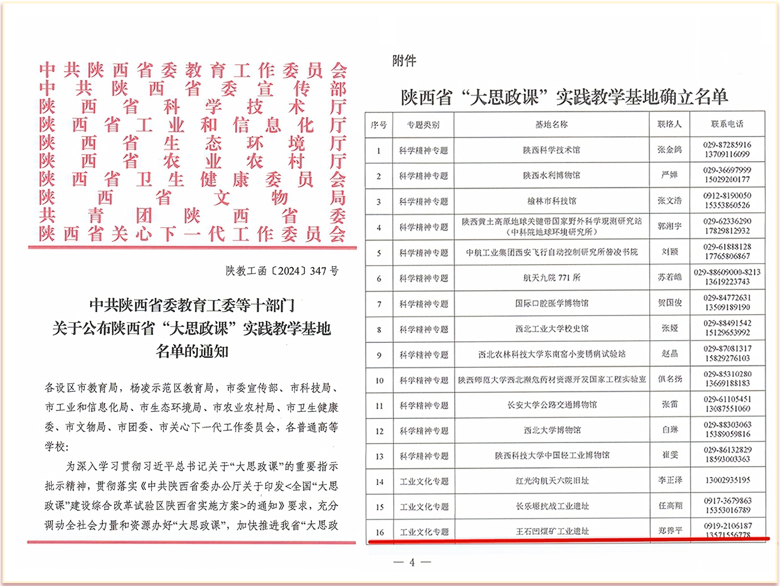 為深入學(xué)習(xí)貫徹習(xí)近平總書記關(guān)于“大思政課”的重要指示批示精神,貫徹落實《中共陜西省委辦公廳關(guān)于印發(fā)<全國“大思政課”建設(shè)綜合改革試驗區(qū)陜西省實施方案>的通知》要求,充分調(diào)動全社會力量和資源辦好“大思政課”,加快推進我省“大思政課”綜合改革試驗區(qū)建設(shè),中共陜西省委教育工委等十部門聯(lián)合確立了一批省級“大思政課”實踐教學(xué)基地。在確立的86家基地中,共有7家單位榮獲工業(yè)文化專題實踐教學(xué)基地,王石凹煤礦工業(yè)遺址名列其中。