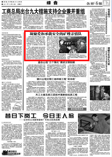 近日,中國婦女報駐陜記者站記者黨柏峰,銅川市婦聯(lián)主席梁秀俠、副主席韋彩霞,礦區(qū)工會副主席梁桂香、女工主任翟永俠等一行沖著礦嫂的名氣來到到徐家溝煤礦,當他們看到著裝整齊、滿面笑容的礦嫂正在為上下井職工熱情服務時,黨柏峰、梁秀俠一行激動地與她們握手、問好。隨后,黨柏峰、梁秀俠一行又聽取了該礦黨政領導李福錦、劉保社與礦區(qū)工會隨行領導等對“礦嫂服務隊”和徐家溝礦近年來安全生產(chǎn)等情況的介紹。據(jù)了解,由12位女工家屬,組成的這支小小的團隊,她們,用忠誠捍衛(wèi)著煤礦的安全,用真情守護著安全的大門,礦工們美譽她們?yōu)椤拔覀兊牡V嫂服務隊”,從17年前開展學雷鋒活動設立的礦工親情驛站到今天的井口服務站,暑日里她們?yōu)榈V工送去了陣陣清涼……冬日里她們?yōu)榈V工送來些許溫暖……她們的行動,不僅讓該礦廣大干部職工為之感動,而且受到了上級組織和有關媒體的關注,在今年陜西省婦聯(lián)開展的“巾幗文明示范崗”評比活動中,她們榮幸的被推薦并評為陜西省“巾幗文明示范崗”,成為銅川和陜西煤炭系統(tǒng)惟一獲得此項殊榮的企業(yè)。通過領導介紹,一行人被“礦嫂服務隊”這種堅守和執(zhí)著的精神深深感動。中國婦女報決定將其事跡在陜西省范圍內宣傳、發(fā)揚、光大。