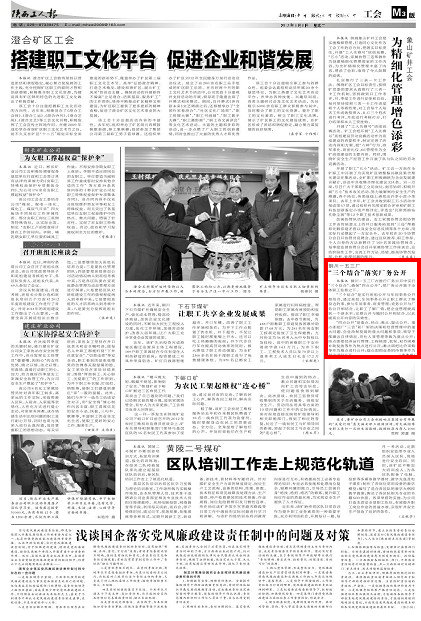 陜西工人報 2013年元月8日 煤業(yè)三版 銅川一五三廠在推行廠務(wù)公開中實行“三個結(jié)合”,確?!八狞c公開”,把廠務(wù)公開置于全體職工監(jiān)督之下?!叭齻€結(jié)合”是實行班組公開與車間事務(wù)公開相結(jié)合,通過班組、車間事務(wù)公開讓職工群眾了解身邊的事,參與車間事務(wù)、班務(wù)管理;黨務(wù)公開與廠務(wù)公開相結(jié)合,讓職工了解廠情,把企業(yè)管理提高到一個新水平;定期公開與隨時公開相結(jié)合,以此提高公開內(nèi)容的實效性。