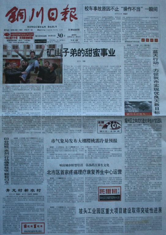 銅川日報 2012年12月30日 頭版頭條
