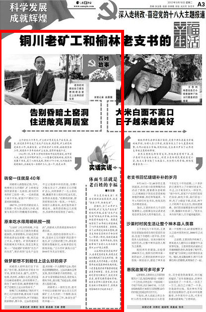 在銅川,當(dāng)了40年礦工的劉順,礦上“先生產(chǎn)后生活”時(shí)他不幸福,后來(lái)“邊生產(chǎn)邊生活”時(shí)他也不幸福,如今他卻顯得幸福感十足。原因是他家住了40年的土磚窯換成了73平米的兩居室。在榆林,當(dāng)了42年村支書(shū)的王恩則,剛當(dāng)支書(shū)時(shí)自家的日子和全村人一樣苦一樣窮,住的是破房子爛窯洞。改革開(kāi)放后,在他的帶領(lǐng)下全村人大米白面不離口,63戶(hù)住上別墅。