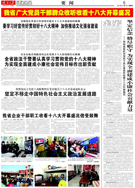 陜西日報 2012年11月9日 第五版 11月8日上午,我省工礦企業(yè)戰(zhàn)線的廣大干部職工通過各種方式認真收聽收看了中國共產(chǎn)黨第十八次全國代表大會的開幕盛況,聆聽了胡錦濤總書記代表第十七屆中央委員會向大會作的報告。大家心情激動,倍受鼓舞,決心將十八大精神化作不竭的動力,為把我省早日建設成西部強省添磚加瓦。延長石油集團所屬10萬石油職工收看收聽了黨的十八大開幕盛況后,大家紛紛表示,一定要以胡錦濤同志的講話為工作指引,實事求是,立足本職,勤懇工作,為建設富裕開放、文明和諧新陜西不懈奮斗。