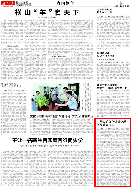 本報(bào)訊(記者 喜 順 通訊員 王銀平)在全國(guó)煤炭市場(chǎng)滯銷嚴(yán)峻的形勢(shì)下,陜煤銅川礦業(yè)有限公司玉華煤礦積極應(yīng)對(duì)煤炭疲軟走勢(shì),抓煤質(zhì)保市場(chǎng),以強(qiáng)勁的“玉華牌”名品信譽(yù),在贏得市場(chǎng)占有率上下功夫,贏得了新老用戶的信賴。