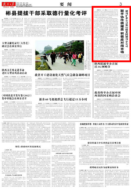 從年初開始,由于國內經(jīng)濟增速減緩,煤炭需求增幅回落,煤炭市場形勢日益嚴峻,加之銅川礦業(yè)公司部分礦井因地質變化,煤質下滑,一度導致煤炭銷售不暢,影響了礦井的生產(chǎn)。面對這一實際,兩公司領導多次聯(lián)系溝通,并且召開了煤質專題會議,提出了一系列可行的措施,制定了提高煤炭產(chǎn)品質量、加強品牌創(chuàng)建、促進煤炭銷售的方案,強調以質量保用戶,保市場。兩公司建立了定期溝通制度、互通銷售、煤質信息,協(xié)調解決煤質管理中的問題;深入市場主動與用戶聯(lián)系,傾聽用戶意見,按照用戶要求,采取切實措施,穩(wěn)定煤質,搞好服務,進一步鞏固與用戶的合作關系。