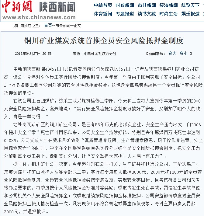 地處高瓦斯礦區(qū)的銅川礦業(yè)公司,是已有56年歷史的老煤炭企業(yè),安全生產(chǎn)壓力較大。自2006年提出安全“零”死亡奮斗目標(biāo)以來,公司安全生產(chǎn)持續(xù)好轉(zhuǎn),特別是去年原煤百萬噸死亡率達到0.086。公司黨政今年在要求各礦做到“瓦斯管理零超限,生產(chǎn)管理零隱患,職工操作零違章,安全目標(biāo)零死亡”的同時,決定在全國煤炭系統(tǒng)率先實行公司級全員安全風(fēng)險抵押金制度,把安全壓力分解到每個員工身上,做到獎罰分明,讓“安全重擔(dān)大家挑,人人肩上有壓力”。