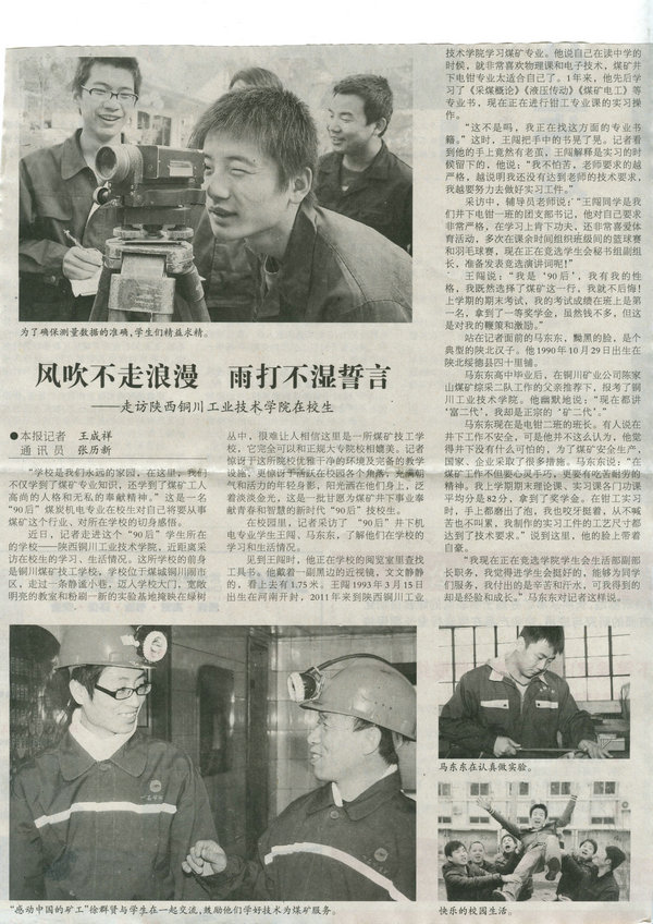 近日,記者走進(jìn)這個(gè)“90后”學(xué)生所在的學(xué)?!兾縻~川工業(yè)技術(shù)學(xué)院,近距離采訪在校生的學(xué)習(xí)、生活情況。這所學(xué)校的前身是銅川煤礦技工學(xué)校,學(xué)校位于煤城銅川鬧市區(qū),走過(guò)一條靜謐小巷,邁入學(xué)校大門(mén),寬敞明亮的教室和粉刷一新的實(shí)驗(yàn)基地掩映在綠樹(shù)叢中,很難讓人相信這里是一所煤礦技工學(xué)校,它完全可以和正規(guī)大專(zhuān)院校相媲美。記者驚訝于這所院校優(yōu)雅干凈的環(huán)境及完備的教學(xué)設(shè)施,更驚訝于活躍在校園各個(gè)角落,充滿朝氣和活力的年輕身影,陽(yáng)光灑在他們身上,泛著淡淡金光,這是一批甘愿為煤礦井下事業(yè)奉獻(xiàn)青春和智慧的新時(shí)代“90后”技校生。