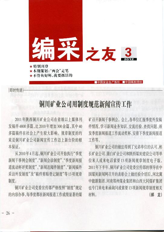 2011年陜西銅川礦業(yè)公司在省級以上媒體刊發(fā)稿件4800多篇,比2010年增加300余篇,其中40余篇稿件在社會上產(chǎn)生較大影響。規(guī)章制度的約束是銅川礦業(yè)公司新聞宣傳工作邁上新臺階的根本保證。
