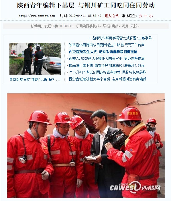 西部網(wǎng)訊(劉孝文攝影報(bào)道)4月8日到4月12日,陜西出版系統(tǒng)的青年編輯們赴銅川礦業(yè)公司所屬8個(gè)礦井開(kāi)展主題教育實(shí)踐活動(dòng),與礦工同吃、同住、同勞動(dòng),了解企業(yè)文化,走訪廠礦領(lǐng)導(dǎo)、優(yōu)秀黨員、先進(jìn)勞模、普通礦工,共同感受改革開(kāi)放三十多年礦區(qū)及礦工生活翻天覆地的變化。