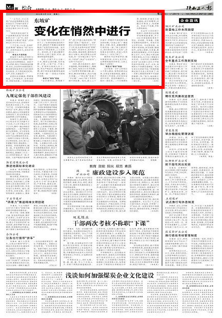 如今,干部下井人人裝一小本,隨時(shí)記錄問題,及時(shí)處理、匯報(bào),上情下達(dá)、下情上傳。礦領(lǐng)導(dǎo)分別深入井下一線,率先嚴(yán)格安全、質(zhì)量現(xiàn)場(chǎng)管理,把干事創(chuàng)業(yè)的激情傳遞到礦井第一線……改變從干部悄然而始。