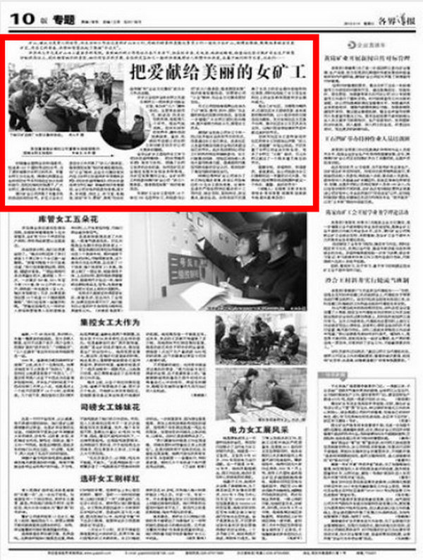 (王 莉 李勝會 李 浩 鄭珊萍)礦山,被認為是男人的世界,而生活和工作在這里的礦山女工們,用她們嬌柔的身軀與男員工們一道戰(zhàn)斗在礦山,拼搏在煤海,默默地奉獻在百里礦區(qū),用自己的青春、熱情和智慧托起了煤?!鞍脒吿臁?。
