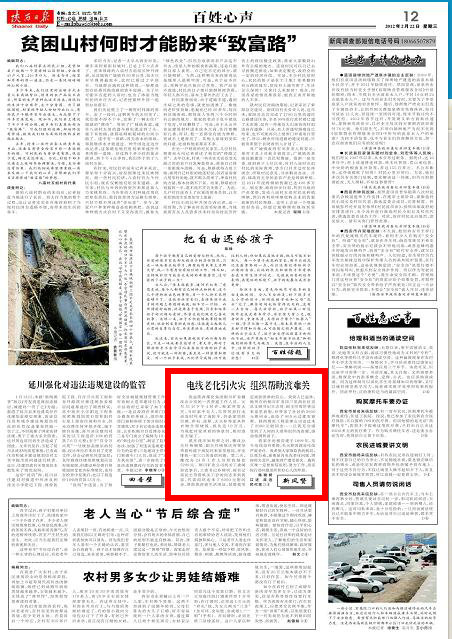 我家住的樓房建于1999年,至今電線沒有更換,失火原因就是電線嚴(yán)重老化。我希望大家吸取我的教訓(xùn),以我為戒,重視屋內(nèi)電線老化問題,增強(qiáng)防火意識,避免財(cái)產(chǎn)遭受損失。遇到災(zāi)難一定要相信組織,努力工作,用實(shí)際行動(dòng)回報(bào)組織和好心人的幫助。(陳曉舜口述 席選民代筆)