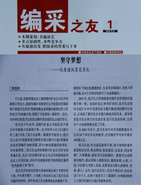范月孔說:作為基層新聞干事,最得天獨(dú)厚的條件就是貼近生活、貼近群眾、貼近基層,信息多,新聞來源廣,只要勤奮,就有寫不完的稿件。要想寫出高質(zhì)量的稿件,就必須深入細(xì)致采訪,做到身到、心到、口到,不僅要與當(dāng)事人見面,還要采訪當(dāng)事人的領(lǐng)導(dǎo)、同事、家人。去年,老范采寫一位生產(chǎn)班長(zhǎng)時(shí),先后采訪了8個(gè)人,從兩個(gè)角度寫了兩篇稿件,分別被《陜西工人報(bào)》,《銅川日?qǐng)?bào)》等媒體采用。