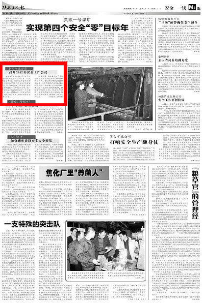 會議要求,要確保公司今年8對礦井全部達(dá)到一級安全質(zhì)量標(biāo)準(zhǔn)化礦井。將實行全員風(fēng)險抵押金制度,以輕傷事故為底線,強化職工安全行為考核,實行月考核、季兌現(xiàn)。通過全員風(fēng)險抵押,體現(xiàn)安全風(fēng)險共擔(dān),利益共享原則,增強全員安全生產(chǎn)意識,促進(jìn)安全責(zé)任落實,規(guī)范職工安全生產(chǎn)行為。