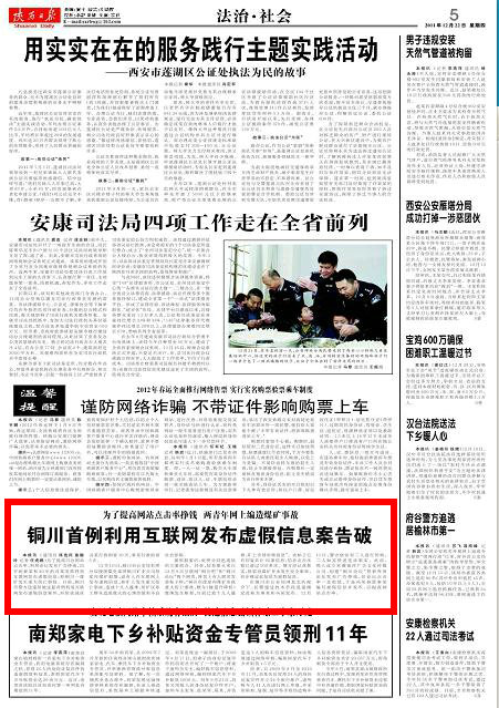 接到報案后,虹橋分局迅速組織立案偵辦。經(jīng)查,信息源頭來自12月9日互聯(lián)網(wǎng)“銅川吧”和“銅川論壇”兩個網(wǎng)頁,網(wǎng)頁上有人匿名發(fā)表帖子稱:“銅川市徐家溝煤礦出現(xiàn)重大傷亡事故,猴車(隧道升降機(jī))纜繩發(fā)生斷裂,目前已致十幾人遇難,礦上全部封鎖消息”。此帖子已有回復(fù)共計32條信息,信息點(diǎn)擊次數(shù)已超過500多次。警方經(jīng)認(rèn)真核實,徐家溝煤礦并未發(fā)生安全事故,初步確定此信息為虛假信息。