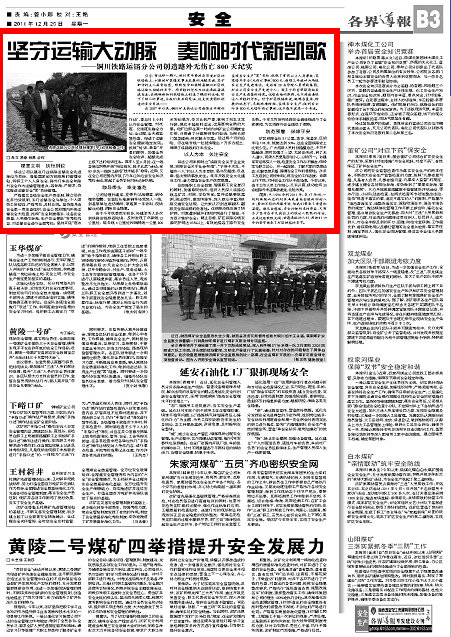 自2007年以來,銅川礦業(yè)鐵運公司連續(xù)五年順利實現(xiàn)安全生產(chǎn)“零”目標(biāo),杜絕了重傷以上人身事故;實現(xiàn)路外安全(無傷亡事故)800天;連續(xù)三年被評為局級安全生產(chǎn)先進單位;先后有28名管理人員榮獲集團、礦業(yè)公司安全生產(chǎn)先進個人;有多個科室榮獲局級安全生產(chǎn)先進集體殊榮。這些成績的取得,無不浸透著鐵運人辛勤的汗水。對于礦區(qū)鐵路來說,能夠在復(fù)雜、險要的地形下,克服艱難險阻,實現(xiàn)安全生產(chǎn),做到安全行車800天無路外傷亡事故,這不能不說是一個奇跡。