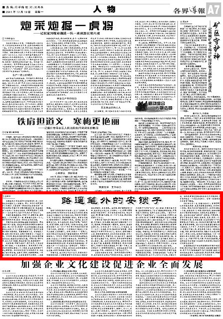 當(dāng)班長(zhǎng)的漫長(zhǎng)歲月里,他和其他班長(zhǎng)協(xié)調(diào)工作,把本班的安全和生產(chǎn)管得井井有條。班里有個(gè)只交牌不下井的“長(zhǎng)毛”,沒人敢惹,安鎖子就不買賬,堅(jiān)決按規(guī)章制止,“長(zhǎng)毛”威脅說要收拾他,安鎖子毫不示弱的說:咱兩個(gè)去后山單練。一腔正氣嚇得“長(zhǎng)毛”不敢再“刺頭”。一次辦農(nóng)轉(zhuǎn)非,辦事的人說請(qǐng)人家的200元“辦事費(fèi)”要他報(bào)銷,他堅(jiān)持讓按規(guī)定把發(fā)票拿來,那個(gè)人便只好作罷。有一次,工作面攉完煤正要向煤墻移溜子,副區(qū)長(zhǎng)雷漢玉卻讓停電檢修機(jī)器。按安全規(guī)章,攉完煤的工作面空頂很大容易冒頂,得抓緊移溜子再打密柱支護(hù)。他便將副區(qū)長(zhǎng)的違章指揮頂了回去,倆人吵得差點(diǎn)動(dòng)手,最后還是安鎖子得勝。安鎖子說:并不是我得理不讓人,而是安全責(zé)任比天大。有趣的是,許多年后,安鎖子和雷漢玉都成了路遙《平凡的世界》中的不更名姓的原型人物。作為班長(zhǎng),他不知多少次為救工人奮不顧身,救的人已記不清有多少個(gè)。有兩次冒頂,分別將工人趙金明和蘆新華埋住了,危難關(guān)頭,安鎖子斥退別人,只身向前,生生將兩個(gè)礦工兄弟由死亡線上拉了回來。