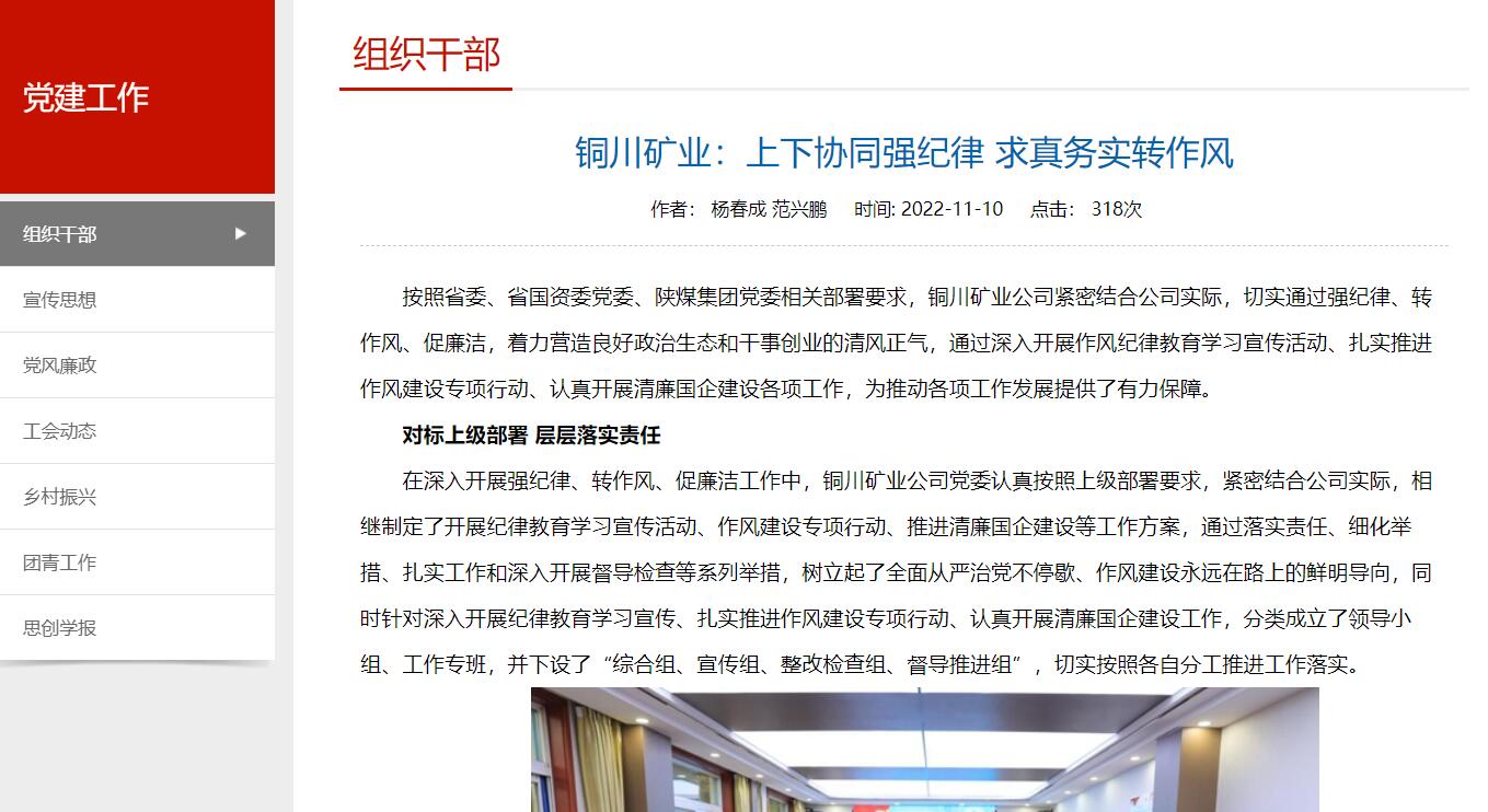 按照省委、省國(guó)資委黨委、陜煤集團(tuán)黨委相關(guān)部署要求,銅川礦業(yè)公司緊密結(jié)合公司實(shí)際,切實(shí)通過(guò)強(qiáng)紀(jì)律、轉(zhuǎn)作風(fēng)、促廉潔,著力營(yíng)造良好政治生態(tài)和干事創(chuàng)業(yè)的清風(fēng)正氣,通過(guò)深入開(kāi)展作風(fēng)紀(jì)律教育學(xué)習(xí)宣傳活動(dòng)、扎實(shí)推進(jìn)作風(fēng)建設(shè)專項(xiàng)行動(dòng)、認(rèn)真開(kāi)展清廉國(guó)企建設(shè)各項(xiàng)工作,為推動(dòng)各項(xiàng)工作發(fā)展提供了有力保障。