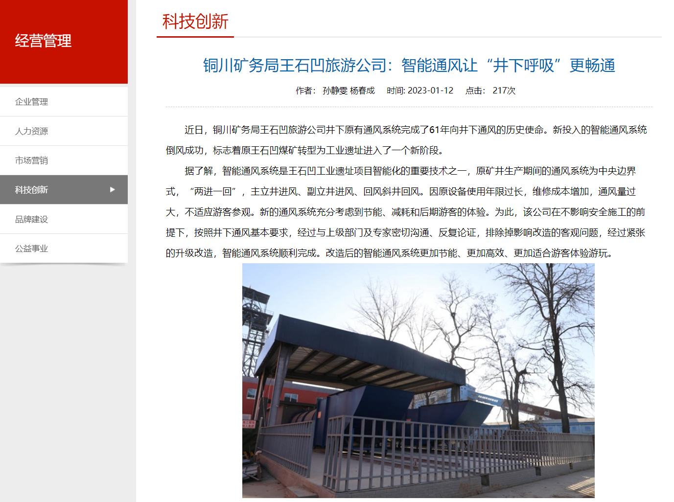 近日,銅川礦務局王石凹旅游公司井下原有通風系統(tǒng)完成了61年向井下通風的歷史使命。新投入的智能通風系統(tǒng)倒風成功,標志著原王石凹煤礦轉型為工業(yè)遺址進入了一個新階段。