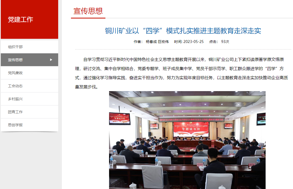 自學(xué)習(xí)貫徹習(xí)近平新時(shí)代中國(guó)特色社會(huì)主義思想主題教育開展以來,銅川礦業(yè)公司上下緊扣讀原著學(xué)原文悟原理,研討交流、集中自學(xué)相結(jié)合,黨委專題學(xué)、班子成員集中學(xué)、黨員干部示范學(xué)、職工群眾跟進(jìn)學(xué)的“四學(xué)”方式,通過強(qiáng)化學(xué)習(xí)指導(dǎo)實(shí)踐,奮進(jìn)實(shí)干擔(dān)當(dāng)作為,努力為實(shí)現(xiàn)年度目標(biāo)任務(wù),以主題教育走深走實(shí)加快推動(dòng)企業(yè)高質(zhì)量發(fā)展步伐。