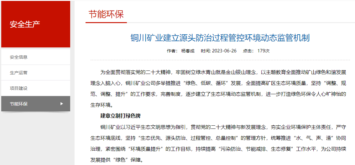 銅川礦業(yè)以習(xí)近平生態(tài)文明思想為指引,貫徹黨的二十大精神與新發(fā)展理念,夯實企業(yè)環(huán)境保護主體責(zé)任,嚴守生態(tài)環(huán)境底線,堅持“生態(tài)優(yōu)先、源頭防治、過程管控、總量控制”的管理方針,統(tǒng)籌推進“水、氣、聲、渣”協(xié)同治理,緊密圍繞“環(huán)境質(zhì)量提升”的工作目標(biāo),持續(xù)提高“污染防治、節(jié)能減排、生態(tài)修復(fù)”工作水平,為公司持續(xù)發(fā)展提供“綠色”保障。