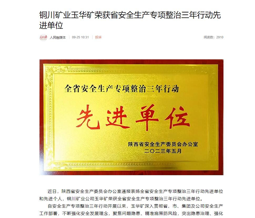 銅川礦業(yè)玉華礦榮獲省安全生產(chǎn)專項(xiàng)整治三年行動先進(jìn)單位