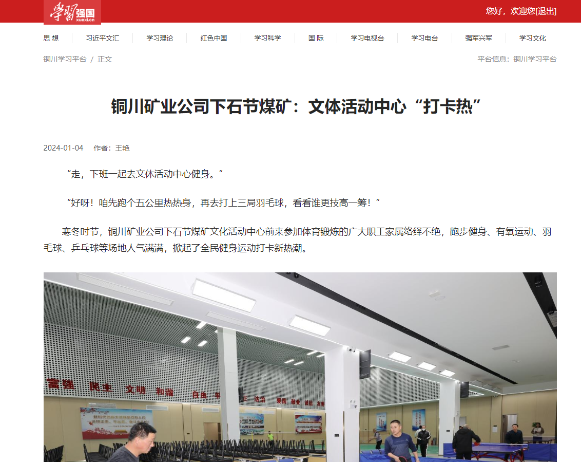 寒冬時節(jié),銅川礦業(yè)公司下石節(jié)煤礦文化活動中心前來參加體育鍛煉的廣大職工家屬絡繹不絕,跑步健身、有氧運動、羽毛球、乒乓球等場地人氣滿滿,掀起了全民健身運動打卡新熱潮。
