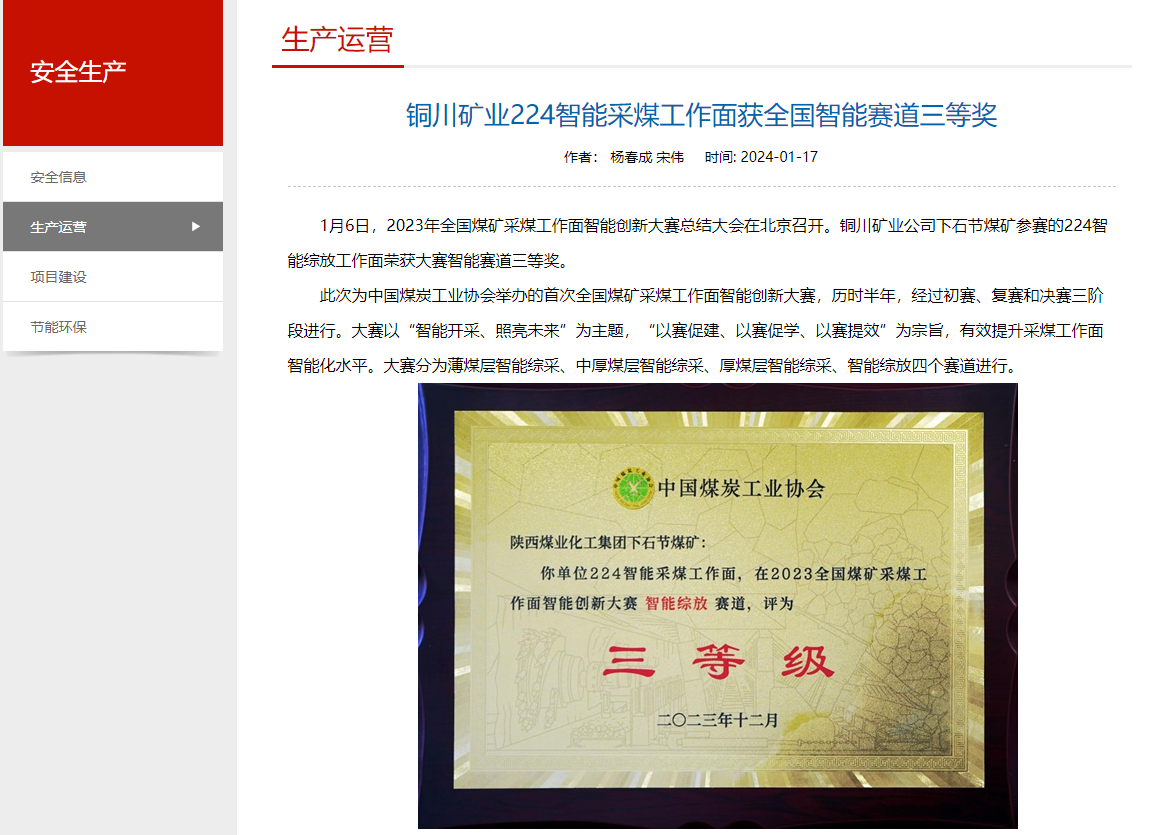 銅川礦業(yè)224智能采煤工作面獲全國智能賽道三等獎