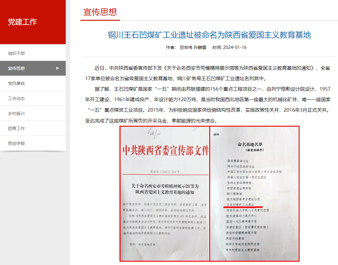 近日,中共陜西省委宣傳部下發(fā)《關(guān)于命名西安市勞模精神展示館等為陜西省愛國主義教育基地的通知》,全省17家單位被命名為省級愛國主義教育基地,銅川礦務局王石凹煤礦工業(yè)遺址名列其中。