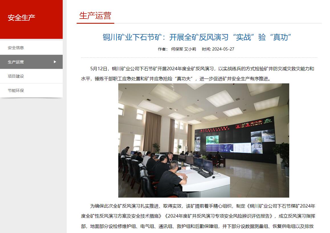 5月12日,銅川礦業(yè)公司下石節(jié)礦開展2024年度全礦反風演習,以實戰(zhàn)練兵的方式檢驗礦井防災減災救災能力和水平,錘煉干部職工應急處置和礦井應急搶險“真功夫”,進一步促進礦井安全生產(chǎn)有序推進。