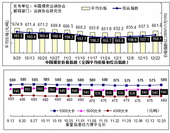 環(huán)渤海港口存煤高位徘徊,價(jià)格繼續(xù)上漲。近日秦皇島港鐵路煤炭調(diào)入相對(duì)穩(wěn)定,下游用戶采購(gòu)情況良好,惡劣天氣一度影響港口煤炭發(fā)運(yùn),錨地船舶數(shù)量有所增多,港口煤炭庫(kù)存量高位徘徊。至12月22日,秦皇島港存煤677萬(wàn)噸,比15日增加6萬(wàn)噸。港口煤炭市場(chǎng)成交順暢,動(dòng)力煤價(jià)格繼續(xù)上漲,其中12月20日秦皇島港5000大卡/千克以外的各品質(zhì)動(dòng)力煤,以及曹妃甸港、京唐港5000和4500大卡/千克動(dòng)力煤價(jià)格比13日均上漲5元/噸;天津港動(dòng)力煤價(jià)格總體平穩(wěn)。