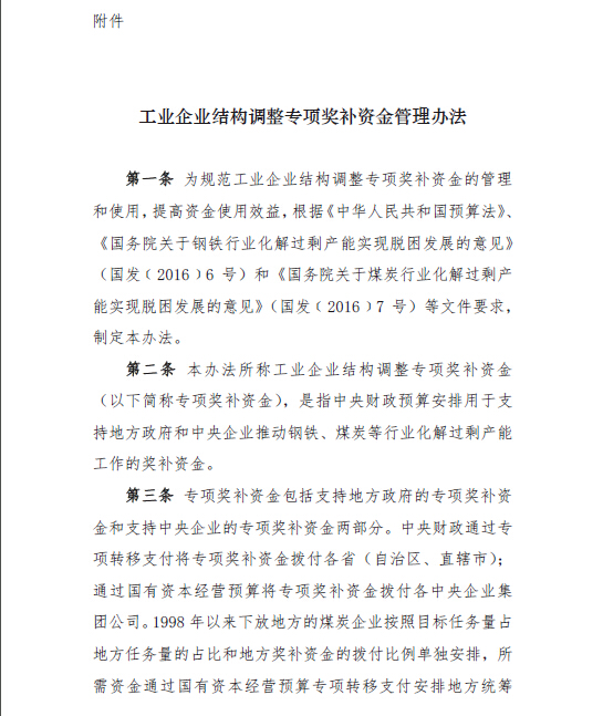 近日,報經國務院審定后,財政部印發(fā)了《工業(yè)企業(yè)結構調整專項獎補資金管理辦法》(財建﹝2016﹞253號,詳見附件),明確中央財政設立工業(yè)企業(yè)結構調整專項獎補資金,對地方和中央企業(yè)化解鋼鐵、煤炭行業(yè)過剩產能工作給予獎補,鼓勵地方政府、企業(yè)和銀行及其他債權人綜合運用兼并重組、債務重組和破產清算等方式,實現(xiàn)市場出清。專項獎補資金規(guī)模為1000億元,實行梯級獎補。其中,基礎獎補資金占資金總規(guī)模的80%,結合退出產能任務量、需安置職工人數(shù)、困難程度等按因素法分配;梯級獎補資金占資金總規(guī)模的20%,和各省份、中央企業(yè)化解過剩產能任務完成情況掛鉤,對超額完成目標任務量的省份、中央企業(yè),按基礎獎補資金的一定系數(shù)實行梯級獎補。專項獎補資金由地方政府和中央企業(yè)統(tǒng)籌用于符合要求的職工分流安置工作。