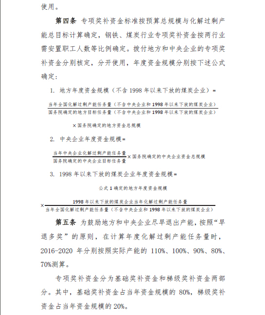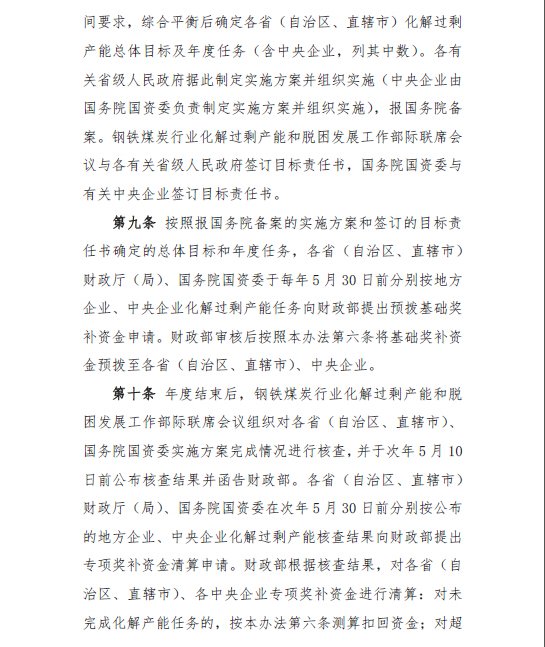 各有關省級人民政府和國務院國資委分別負責制定本地區(qū)和中央企業(yè)化解鋼鐵、煤炭行業(yè)過剩產能實施方案并報國務院備案。發(fā)展改革委等部門綜合平衡并確定各地區(qū)、中央企業(yè)化解鋼鐵、煤炭過剩產能任務后,財政部即按照資金管理辦法有關要求撥付獎補資金。
