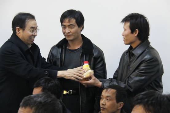 鴨口公司董事長(zhǎng)兼總經(jīng)理張會(huì)縣、黨委書記蘭阿利、副總經(jīng)理閆社會(huì)、工會(huì)主席王泰昌正在送慰問品。