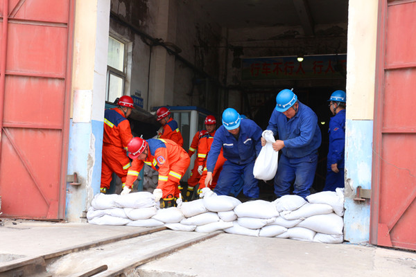 總指揮發(fā)出指令,汛期“三防”領(lǐng)導(dǎo)小組成員、防汛搶險(xiǎn)小隊(duì)、救護(hù)中隊(duì)迅速到達(dá)各自集合點(diǎn)位,應(yīng)急救援的技術(shù)、安全、醫(yī)療、保障、通訊等小組各自就位。各救援小組和防汛搶險(xiǎn)小隊(duì)按照進(jìn)一步指令立即趕赴災(zāi)情地點(diǎn),實(shí)施應(yīng)急處置。整體搶險(xiǎn)救援分為三個(gè)步驟同時(shí)進(jìn)行,搶險(xiǎn)小隊(duì)到達(dá)北風(fēng)井工業(yè)廣場,采取堵、疏、截、排等措施對險(xiǎn)情進(jìn)行處置,防止雨水倒灌。救援小組在副井口接應(yīng)井下撤離人員并進(jìn)行人數(shù)清點(diǎn),對身體不適人員進(jìn)行詢問檢查和醫(yī)療救治。各基層區(qū)隊(duì)按照分區(qū)包片所負(fù)責(zé)的防汛區(qū)域排水系統(tǒng)進(jìn)行巡查,組建區(qū)隊(duì)搶險(xiǎn)隊(duì)做好應(yīng)急搶險(xiǎn)救援準(zhǔn)備。